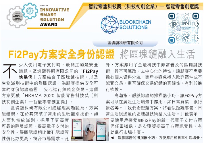 Thanks for the interview! #HKRMA香港零售管理協會 #SmartRetailingAwards2020 We won the Innovative Smart Solution Award in the Smart Retailing Awards of 2020 with our #Fi2Pay project. Our self-owned project Cashless Payment Solution - #Fi2Pay is a #blockchain enabled “Cashless Society” project utilizing bio-metric authentication. #BlockchainSolutions will continue to bring more #Innovative blockchain solutions to the society, stay tuned! 謝謝訪問!我們以 #融貳付 #Fi2Pay 獲得HKRMA-智能零售大獎2020 初創企業一智能零售創意獎 #融貳付 #Fi2Pay 是新一代的無現金交易方案,利用生物識別技術為顧客進行身份驗證,並完成交易。 我們會繼續為向各行業研發更多區塊鏈解決方案,敬請期待! #HKET #HeadlineFinance #經濟日報 #頭條日報 #頭條財經 #HKRMA #Award